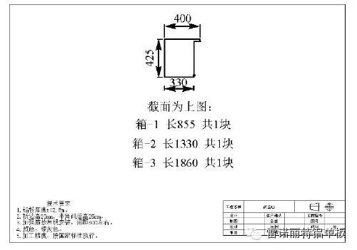 對于等截面的板型,截面法是最優(yōu)的繪制方法。等截面并不意味著板型的簡單,但不管其有多復(fù)雜,只需繪出截面的圖形,并注明長度就可以將其形狀表達(dá)清楚。判斷一個單板是否屬于等截面板型是截面法的前提。首先板材要有眾多棱互相平行,這就是板材的長度方向; 然后再看垂直于板材的所有截面是否完全一樣,如果都滿足,就可以采用截面法。要注意的是某些有缺口或封頭的板材容易被誤認(rèn)為等截面,實際上是等截面板型的減少、增加。這類板型不能采用等截面法; 即使添加詳細(xì)的附加說明也極易引起誤解,因為其減少、增加形狀的位置難以說明,并有著嚴(yán)格的方向性。對于這種板型采用視圖法、軸測法都比較合適。L 型板、U型板、M 型板( 反L 型,而非字母M 形狀的板型) 等常見板型均為等截面。建筑立面最上端裝飾時常作造型,采用鋁單板時,中間部分多為等截面板型。圖2 即應(yīng)用截面法繪出。